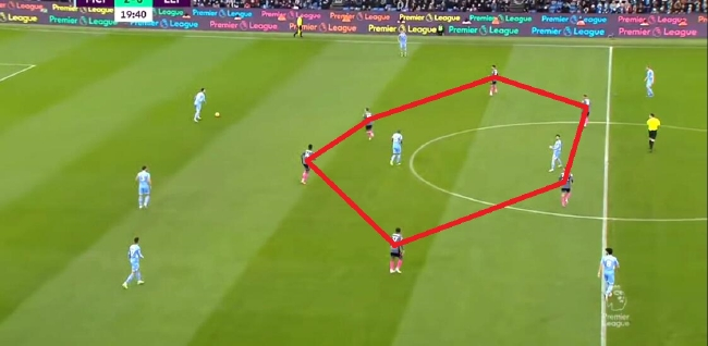 阵型上虽然排出了442,看起来可以覆盖横向的大部分空间,恰好对应上现在曼城进攻时需要经常横向转移的策略,然而到了实际比赛中就可以发现,莱斯特城的前场六人有着特殊的战术职责。