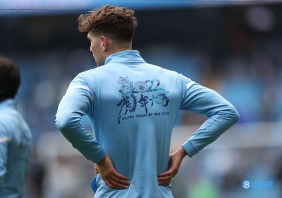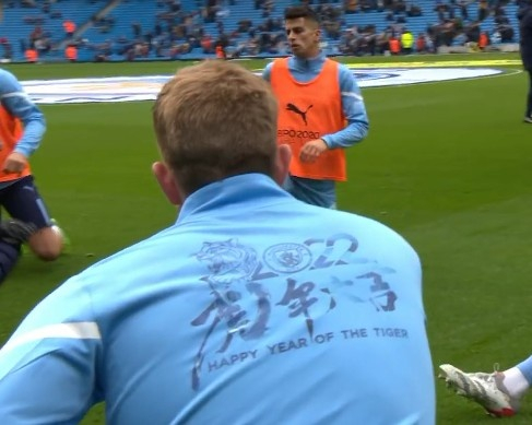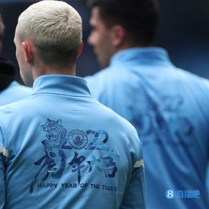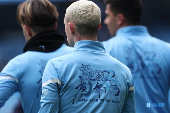 赛前热身环节,曼城球员统一身着“虎年大吉”的训练服。在赛中,曼城主场的场边广告牌也打出了“城意满满,虎年大吉”的标语。