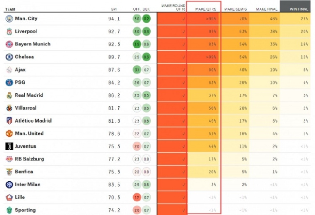 直播吧3月8日讯 欧冠1/8决赛次回合明晨陆续打响,大数据网站fivethirtyeight预测了16队晋级欧冠8强的概率。