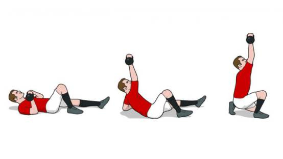 躺在地上,用右手握住壶铃,右臂向上伸直。肩膀需要保持紧绷,而右腿弯曲,右脚移到左膝盖旁。右脚蹬地,翻转身体,用左髋支撑身体,左肘触地。身体继续向上移动,以左手支撑身体。用左手和右脚来支撑身体,身体向上移动直到离开地面。接着,左腿向后移动,左膝跪地。必须要让左膝接触地面,并低于左髋,手臂锁定要更稳。右脚支撑在地上,壶铃在右手上并举高到头部以上,这时打开的姿势要比之前身体弯曲时的姿势有力量,因为全身的肌肉都被调动起来了。并且肩部的力量会得到发挥,也避免了手臂过于疲劳。身体侧弯,半跪。接着,深呼吸,绷紧肌肉,利用箭步蹲动作起立。最后将上面的动作颠倒过来进行,直到躺下,才算所有动作都完成。身体的下移是比较困难的,但是对肌腱和韧带力量的提升有很好的帮助作用,也保证了动作的完整性。完成这八个步骤算一次,每个手臂做3次,每次休息1分钟。