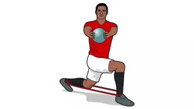 在你双脚脚踝上套一个弹力带,并准备一个实心球(哑铃等其他器材也可以)。双手捧起实心球,做蹲马步动作,然后弓步走,迈出左脚,同时向左旋转你的上半身,保持球和身体在同一方向。然后再换右脚走,同时上半身向右旋转,保持球和身体在同一方向。再重复上述动作往前走。