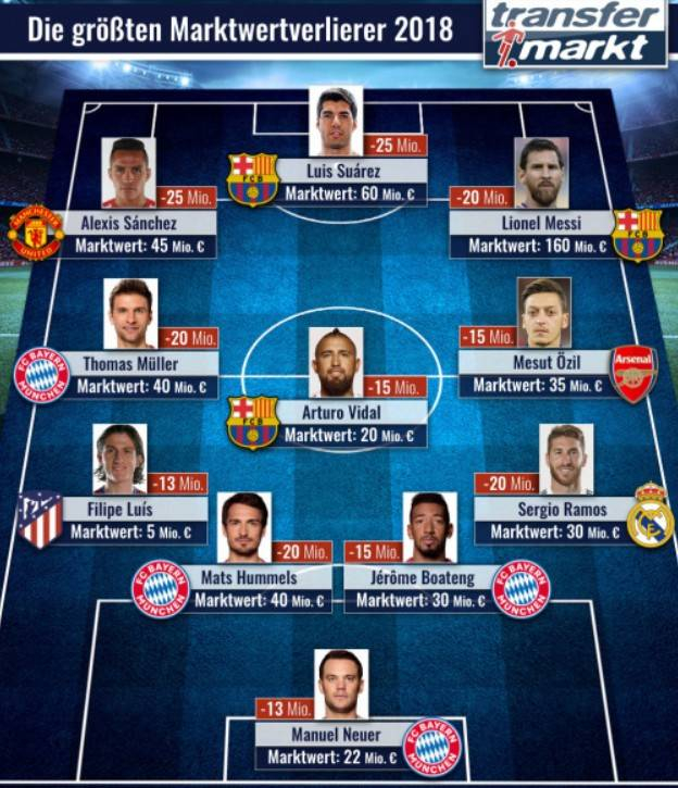 2018年度正式结束,那么在过去一年里,哪些球员的身价下降幅度最大呢?德国《转会市场》评出了一套2018年球员身价下跌幅度最大11人阵。