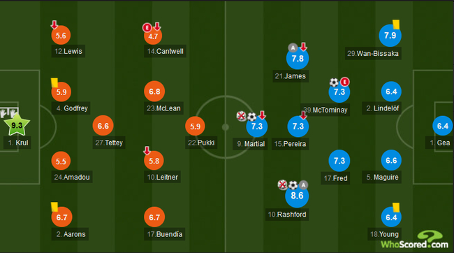 第43分钟曼联获得本场第二个点球,由于此前拉什福德射失,这一次换做马夏尔主罚,但又被克鲁尔扑出。第53分钟,詹姆斯斜传,马夏尔又获得良机,但这次他的低射又被克鲁尔神勇扑出。