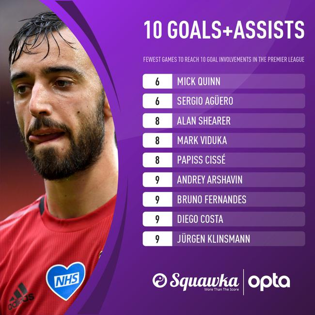 布鲁诺之前,在曼联历史上前9场英超联赛制造进球(进球+助攻)最多的球员是坎通纳与范佩西,他们在前9场英超联赛中都制造了10粒进球。但布鲁诺在本轮完成1射2传之后,这样的历史纪录正式作古,他成功了刷新的曼联的队史。