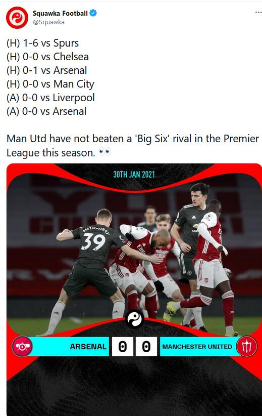 截止到目前,本赛季英超里,曼联已经与BIG6的其他对手踢过6场比赛了,总战绩为4平2负,未尝胜绩。具体战绩为依次为:主场1-6热刺,主场0-0切尔西,主场0-1阿森纳,主场0-0曼城,客场0-0利物浦,客场0-0阿森纳。6场比赛里,曼联甚至只进了1个球。