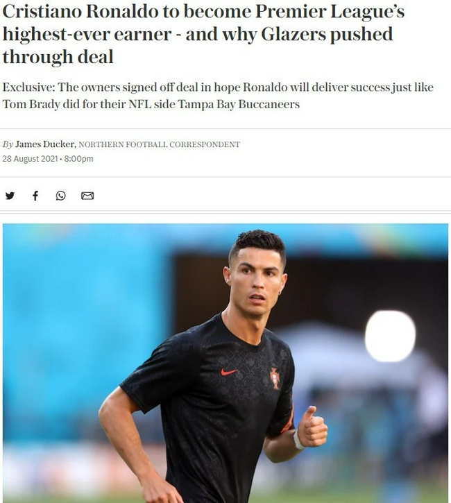 电讯报报道,C罗在曼联的周薪最高可超过56万镑,其中包含奖金和肖像权收入。