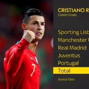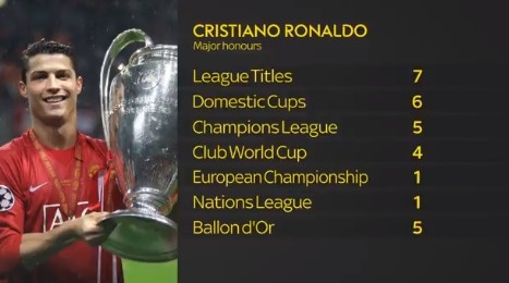 C罗正式回归曼联。英国《天空体育》回顾了C罗到目前为止,职业生涯的主要数据与主要荣誉。