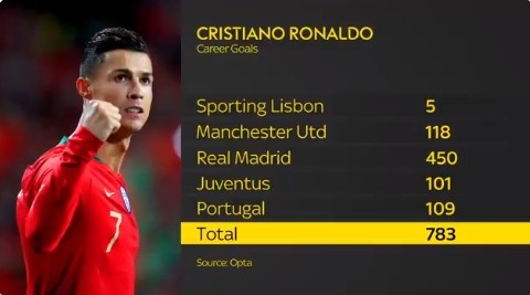 C罗到目前为止总共打入了783球。其中在葡萄牙体育打入5球,在曼联打入118球,在皇马打入450球,在尤文图斯打入101球,在葡萄牙国家队打入109球。
