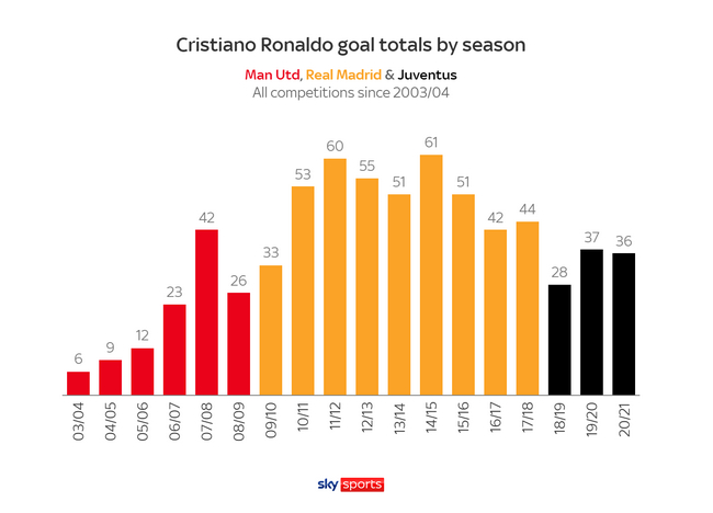 当然了,环境不同、联赛不同、球队不同、战术不同,这些区别都会影响到球员在球场上的发挥,但不可忽视的就是C罗的年龄。
