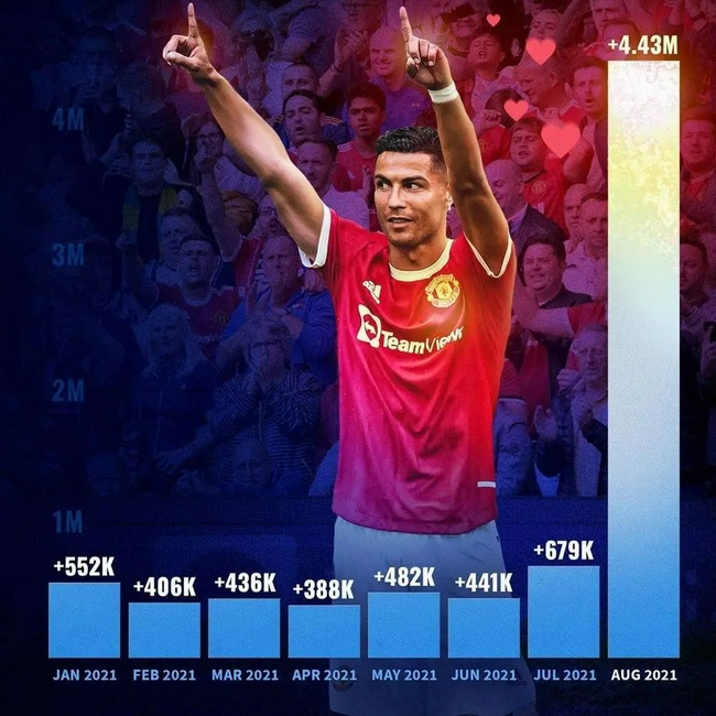 除此之外,C罗也为曼联带来了更多的粉丝量和关注度。今年前7个月,曼联官方社交媒体粉丝数量的每个月的涨幅都保持在30万到70万之间,而就在C罗与曼联走得越来越近的8月,粉丝数量涨幅达到了443万之多,这个数字也超过了前7个月的累积之和。