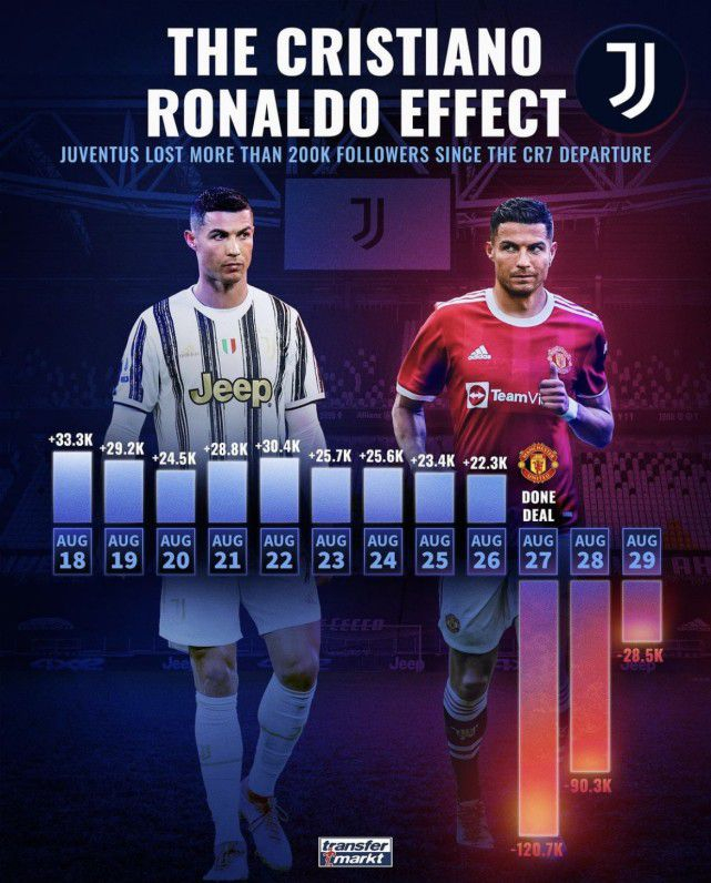 类似的事情,在C罗加盟尤文图斯时也曾发生过,只不过在这个夏天,意甲豪门成为了受到负面影响的一方。确定离队的三天内,尤文图斯社交媒体的粉丝数量就减少了20万。