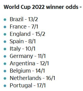 2022卡塔尔世界杯的夺冠赔率,巴西位列第一。