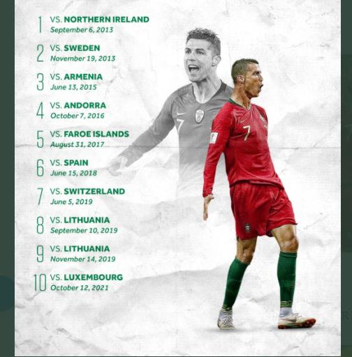 C罗的10个帽子戏法,对手分别是北爱尔兰、瑞典、亚美尼亚、安道尔、法罗群岛、西班牙、瑞士、立陶宛(2次)、卢森堡。