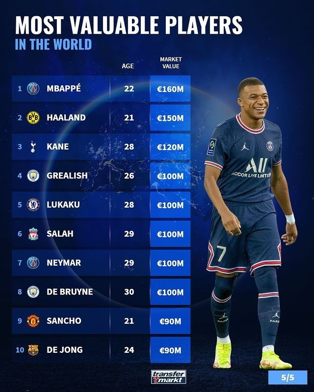 其中,姆巴佩以1.6亿欧元位列第一。