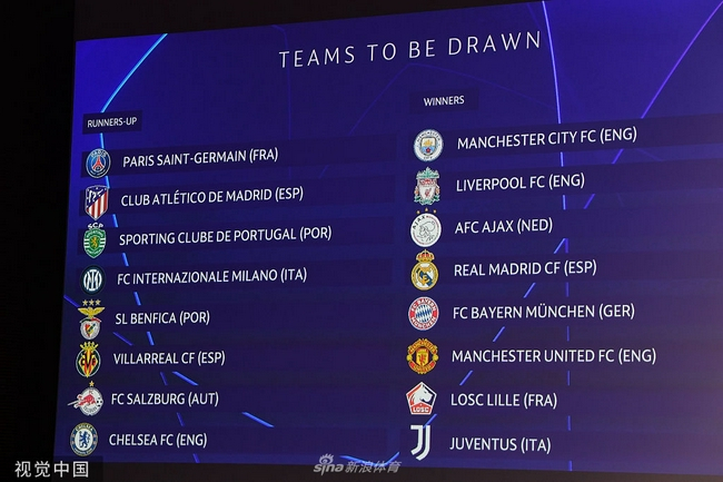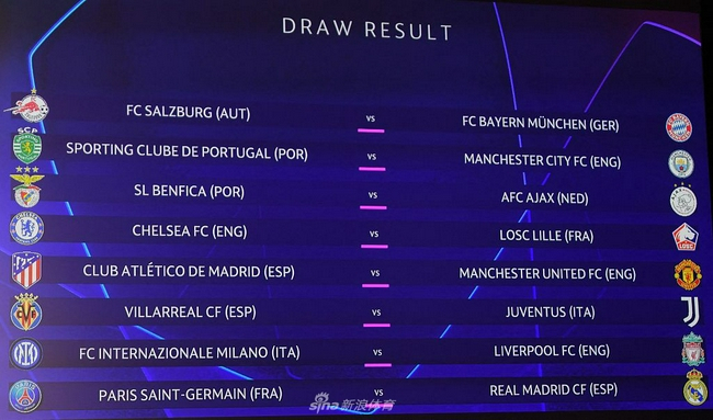 剩余的对阵分别为萨尔茨堡红牛VS拜仁慕尼黑,葡萄牙体育VS曼城、本菲卡VS阿贾克斯、切尔西VS里尔、比利亚雷亚尔VS尤文图斯和国际米兰VS利物浦。