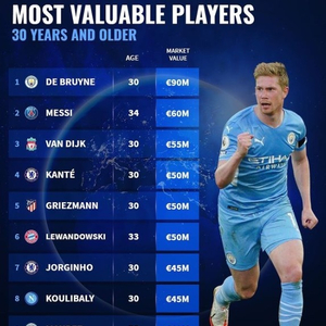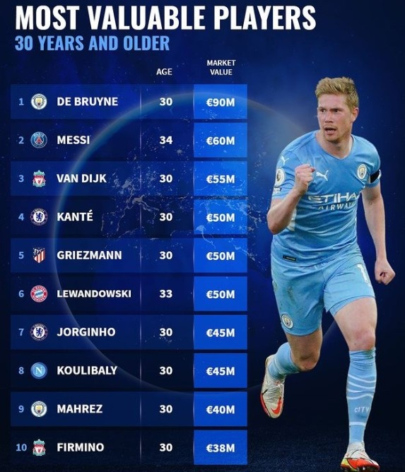 1。德布劳内,曼城,30岁,9000万