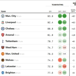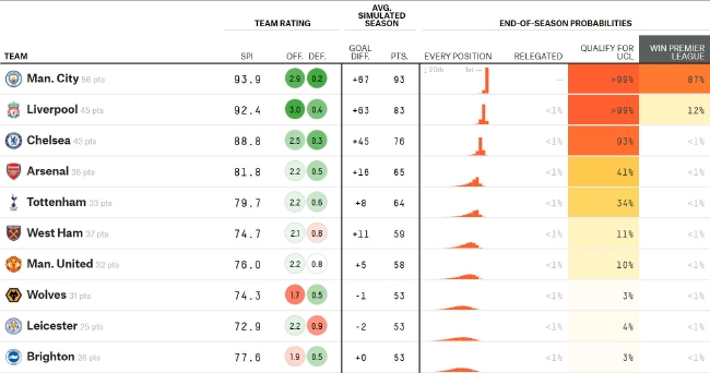 著名大数据网站FiveThirtyEight最新根据目前的即时英超积分榜,预测出了本赛季英超最终的排名。