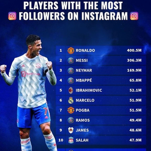梅西以3.06亿粉丝数排名第二位,排名第三第四的是巴黎双星内马尔与姆巴佩。排在第5位的是AC米兰的伊布拉希莫维奇。排在第6-第10的分别是皇马的马塞洛、曼联的博格巴、巴黎的拉莫斯、卡塔尔赖扬的哈梅斯-罗德里格斯与利物浦的萨拉赫。