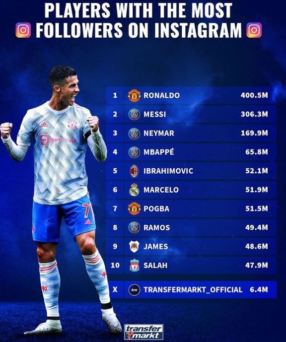 日前,德国转会转会统计了足坛球星在社交媒体ins上的粉丝数量。