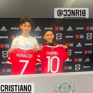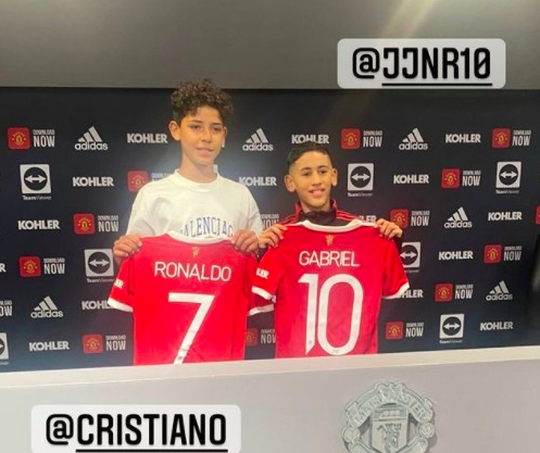 去年夏天,C罗以1500万从尤文加盟曼联。迷你罗也跟随自己的父亲加盟曼联U12,从签约照来看,迷你罗的身体条件非常出众。他与一起签约的10号加布里埃尔,整整高出了一个头。