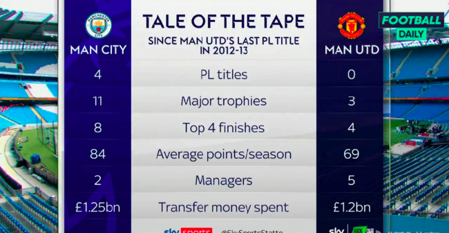 曼市德比,曼联客场1-4负于曼城。英国《天空体育》统计了在弗格森退休之后,两支球队的投入以及所获得的荣誉。曼联与曼城的投入相比,但蓝月亮要多8个冠军。