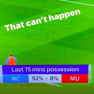 从内维尔晒出的图片来看,在过去的15分钟,曼城的控球率高达92%,基本上球一直在曼城的脚下传递,曼联只有被挨打的份。