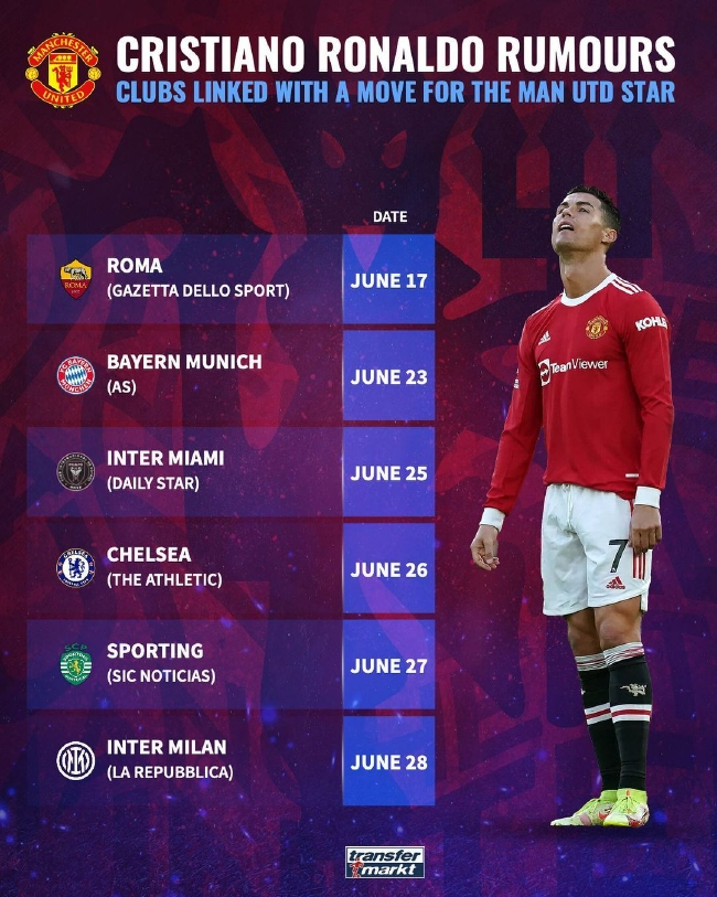 据德国“转会市场”网站统计,11天的时间,C罗已经与6家俱乐部联系在一起。