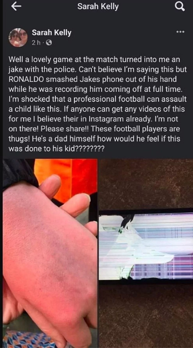 37岁的C罗为损坏这位男孩的手机而道歉,后来因涉嫌殴打和刑事损害而接受了警方的询问,最后遭到警告。