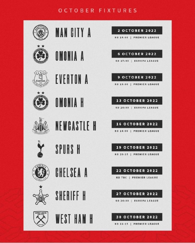 曼联官方晒出了球队10月份的赛程表,并写道:“10月,我们准备好了。”
