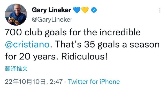 著名的“梅吹”、英格兰足球名宿莱因克尔都特别称赞了C罗:“C罗第700个俱乐部进球,难以置信!这意味着20个赛季里每个赛季要进35个球。这简直荒谬!”