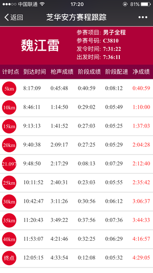 作为资深跑者的魏江雷,与北京马拉松赛结缘已久。有过两次全程、三次半程北马经验的他轻松完成挑战,如果不是事出有因这次的成绩还会更上层楼:“几次北马的全马都是在4小时29分左右,其实今年训练成绩不错,有机会刷新PB(个人最好成绩)的。原本约了两位跑友要陪他们完成初马,但在5公里处等了十分钟左右都没能等到他们,有点遗憾。”
