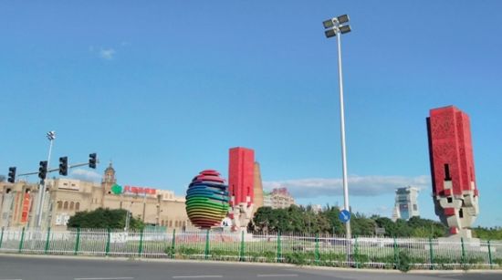 当跑到北土城时,我们看到两侧有两个巨大的方形印章式建筑,中间是一个巨大的彩色圆球。天地方圆,自成一景。