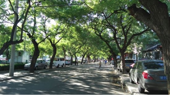 从景山后街到景山西街,再到北长街的途中,每个四合院和店铺都挂着鲜艳的五星红旗,闪烁的阳光透着枝繁叶茂的古槐,绿叶与红旗相映成景,美不胜收。