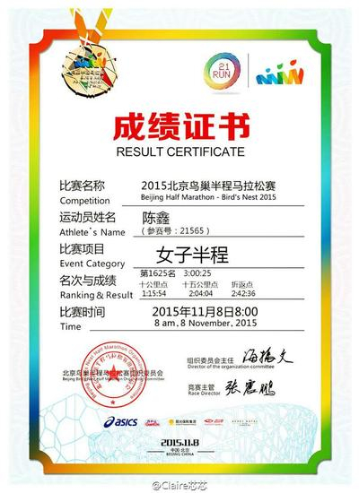 10月9日,朋友Angela发来“2015.11.08北京鸟巢半程马拉松赛”的介绍和报名链接,问我要不要参加,很是犹豫啊!半程马拉松21.0975km,我最多只跑过15km,成绩还不是很理想,所以半马还是很让我胆怯的。但是这次比赛有足够的吸引力,因为比赛的终点冲刺线是在鸟巢里面,我从来没有去过鸟巢,如果能够以一个参赛者的身份去鸟巢冲线,那感觉一定是酷毙了,想想都很激动。