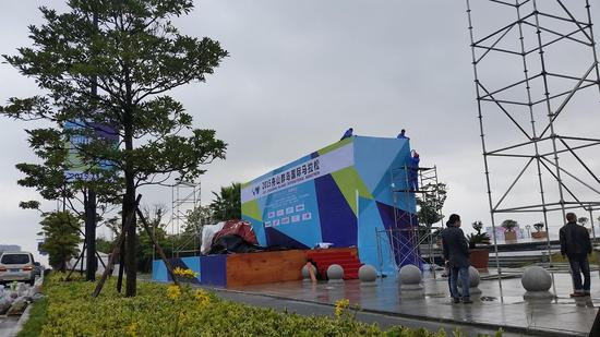 比赛起点设在海洲路普陀大剧院北侧,选手装备领取处和品牌展示区也位于起点附近。由于距离比赛还有两天,又是工作日展会现场略显凋零。一路沿海前行,再绕城区一圈,回到起点,这便是本次迷你马拉松的路线,全长5公里。