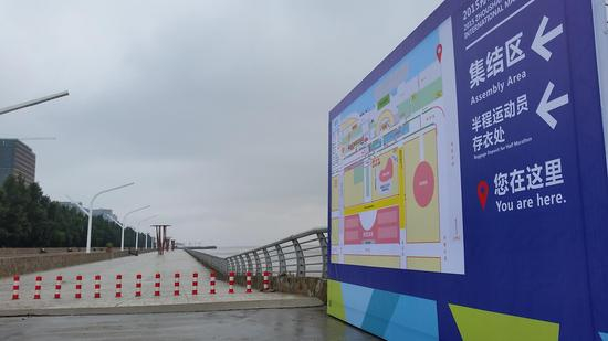 跑道上,开始陆续放置起比赛指示牌,关键点位处也放置了地图指引,并标注说明了跑者所在位置、集结区和存衣处等等。