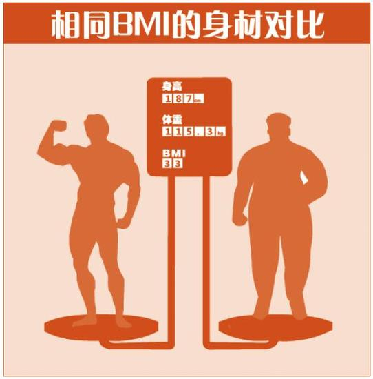 另外一种可能就是你练出了更多的肌肉,肌肉的密度高于脂肪,也就是相同重量,肌肉的体积远小于脂肪。长时间的运动消耗掉了你身体里的脂肪,同时也增加了肌肉的比例,因此虽然体重秤上的数据是一样的,但是实际看上去你却变瘦了,体型更好了。如下图所示,即使是同样的身高体重,胖瘦也是大相径庭,所以我们要辨证地看待体重。