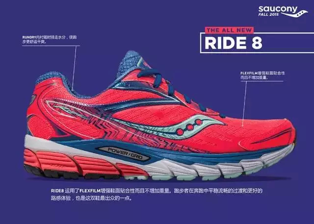 “全新Ride 8将改变人们对训练鞋舒适度的看法”,圣康尼全球产品高级副总裁帕特。奥麦利评论道,“我们希望设计出一款完美融合该系列惯有设计元素和最新技术的标志性跑鞋。我们十分重视跑鞋使用者的反馈和建议。他们总是不停地告诉我们轻便是最重要的,越轻就越快。通过将FlexFiLm材料应用在鞋面上,Ride 8可以改善穿着舒适度(重量未增加)。我们还调整了鞋跟部分,以为跑者带来更加持久顺畅且感应性极强的奔跑体验。”