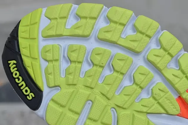 Saucony Ride 8采用的外底和Ride 7一样,前脚掌的沟槽共有7条,这样的设计能够让跑鞋有更大的弯曲度提升前脚掌的灵活度,同时iBR+大底改用弹性橡胶材质打造,比传统的橡胶要轻了33%。同时还配合PowerGrid在缓震上面更好的提升效果。而之前我们提到的8mm的前后脚掌落差可扩大腓肠肌—比目鱼肌—跟腱系统活动范围,抵消足部运动时的阻力,增强脚部抓地力,使步幅更加有力。