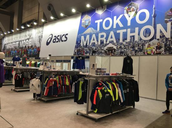 装备购买区分为成人区以及儿童区,本次展示并且售卖的不仅仅有跑鞋,还有跑步的全套装备,压缩裤,袜子,手套,帽子,腰包等等,种类繁多,让人眼花缭乱。值得一提的是,本次亚瑟士展区的鞋款,按照马拉松跑者的不同等级做出了精确的区分,按照完成全马的时间来算,这次跑鞋的货架分成完赛3小时内,4小时内,5小时内三种,同时还单独陈列出日本生产的鞋款以及本次2016东京马拉松的三款特别版。展会时间刚刚过半,特别版售罄,而陈列的大部分亚瑟士的鞋子也基本上断码,可见跑者的购买热情有多高涨。不仅仅是跑鞋,本次东京马拉松的限量版相关服饰以及周边产品也深受跑者欢迎。