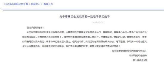 临沂马拉松在收到投诉时,也表示了难处,公开发表声明表示:“赛事结束至今,主赞助商费用仍然没有到位,给承办单位造成巨大压力。但无论如何,我们仍然在积极研究解决办法,绝不逃避,争取第一时间内把奖金发放给获奖选手,因此事造成的不良影响,我们表示最诚挚的歉意,希望大家能够给予理解和原谅!”