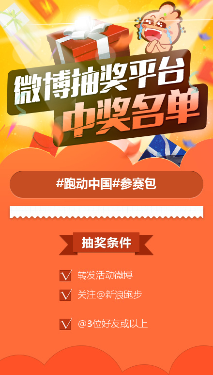 以上中奖跑者,请在收到相关通知时,回复个人信息(姓名、电话、地址、邮编)至新浪跑步微信公众号,我们将尽快寄出奖品。若逾期一个月未回复信息者,则视为自动弃权。本活动最终解释权归新浪跑步,感谢广大跑者对我们一直以来的支持和关注!