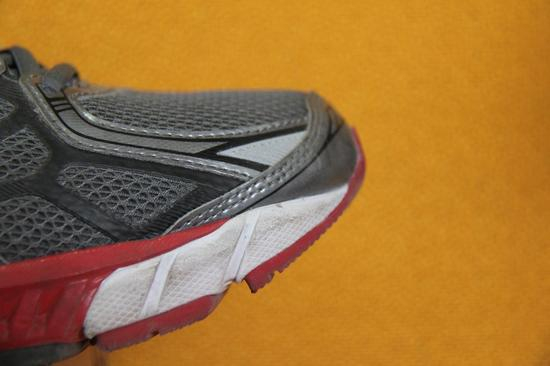 中底上层采用QUIKFOAM材质(中底红色部分),这部分特别柔软如上图所示,轻轻一捏形变明显。外腰前掌直接接地,内腰延伸至后跟,加强缓冲性能的同时拥有高回弹特点,落地时积聚更多能量然后释放,让跑步更省力。