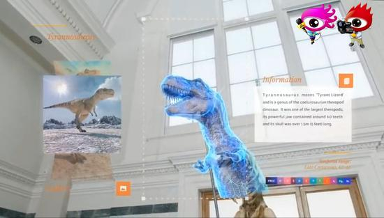 AR(增强现实)——没有完全遮断真实世界,而是在真实场景下叠加虚拟影像,带来全方位的信息化体验,如博物馆作品介绍: