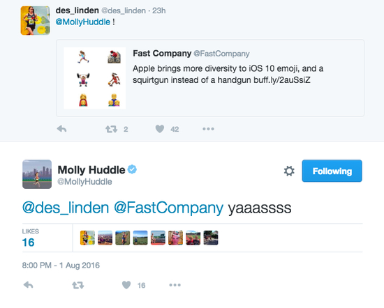 6月,脸书率先在信息平台上推出了女跑者表情,而如今,她的愿望终于也在苹果平台上得到了满足。