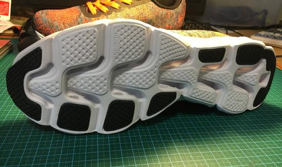 可能针对的用户群体大多是入门跑者,后跟着地是常态,因此,其后跟的大底显得更为厚实,从而提升整双鞋的耐用性和稳定性。接触地面鞋底大面积是发泡材料,只有三份一的面积是橡胶材料,导致抓地性能自然有所减弱,特别在花岗岩地板或湿滑的路面可能出现导致打滑。