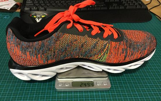 重量并没有想象中的轻,以我41.5码的鞋,单只(41.5码)就249g了,重量上没有绝对的优势。起步会感到要比起马拉松跑鞋穿其他的鞋稍稍要用丁点力。而且我体重在70KG左右,步频在168左右,步伐比较大,对于我这个体重来说,对一双鞋子缓震的好坏是很敏感的。EVA发泡的大底,缓震效果较为出色, 但是整个鞋子支撑略显单薄,但是踩上去踏实没有发虚的感觉。因此我不选用太轻的跑鞋,以便可以长时间支持我的双腿。