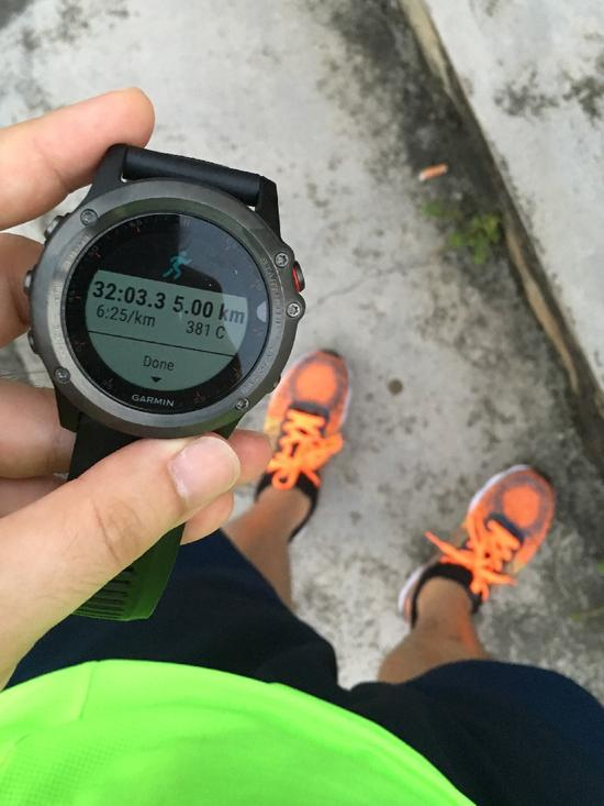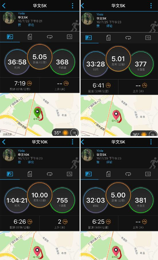 公路+橡胶跑道,广州平均温度37度高温,分别跑了三个5公里和一个10公里体验,