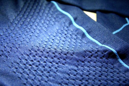 男子下裤臀部后侧,有一块倒三角区域,是LP 3D气流调节区。该功能区每1平方厘米就有10个微气孔,运动时,微气孔不断张合,促进衣物与皮肤间冷热气流循环;休息时,微气孔闭合,防止温度流失,避免体表温度落差过大,保持身体最佳状态;立体V字柱状组织在运动过程中随身体延展,增加与皮肤的接触面积,可帮助汗水经过芯吸作用快速传送到衣物表面,实现高效吸湿。