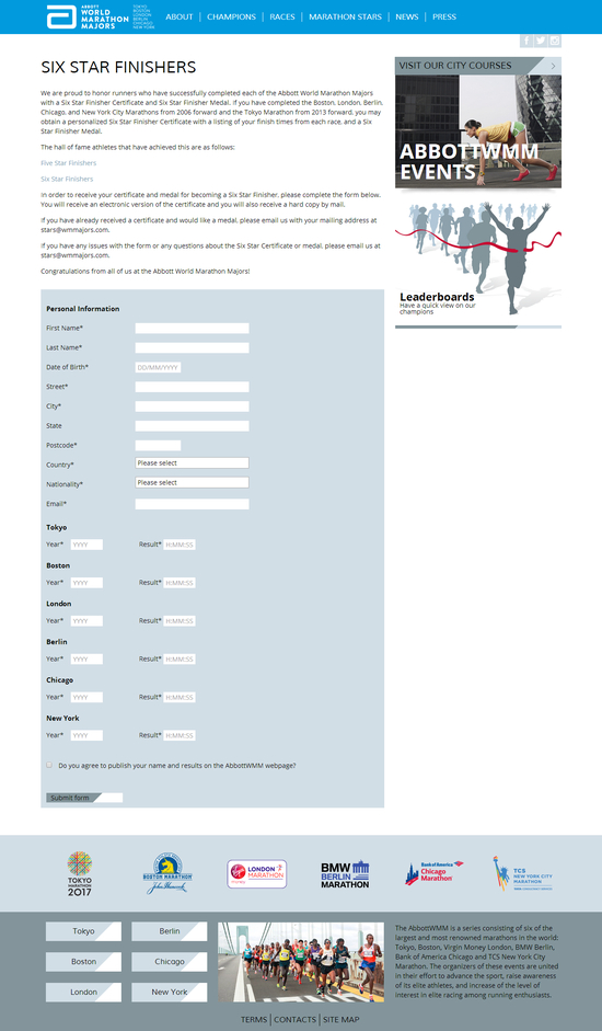 想要获得梦寐以求的六星完赛者奖牌的跑者们要注意,你还需要填写一份世界马拉松大满贯系列赛的表格。链接地址如下:https://www.worldmarathonmajors.com/marathon-stars/